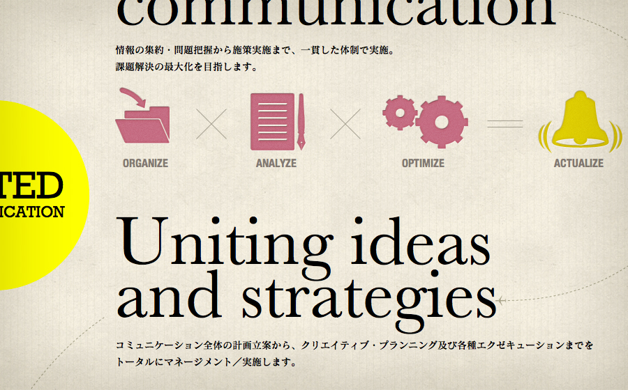 デザインのトーンに関しては「知的」「エネルギッシュ」などのキーワードからベージュを基調とした色使いの背景にピンストライプを配置し知的さを演出、6カラムに分かれたグリッドレイアウトをベースに画面を大胆に横断するように各エレメントをレイアウトしました。
