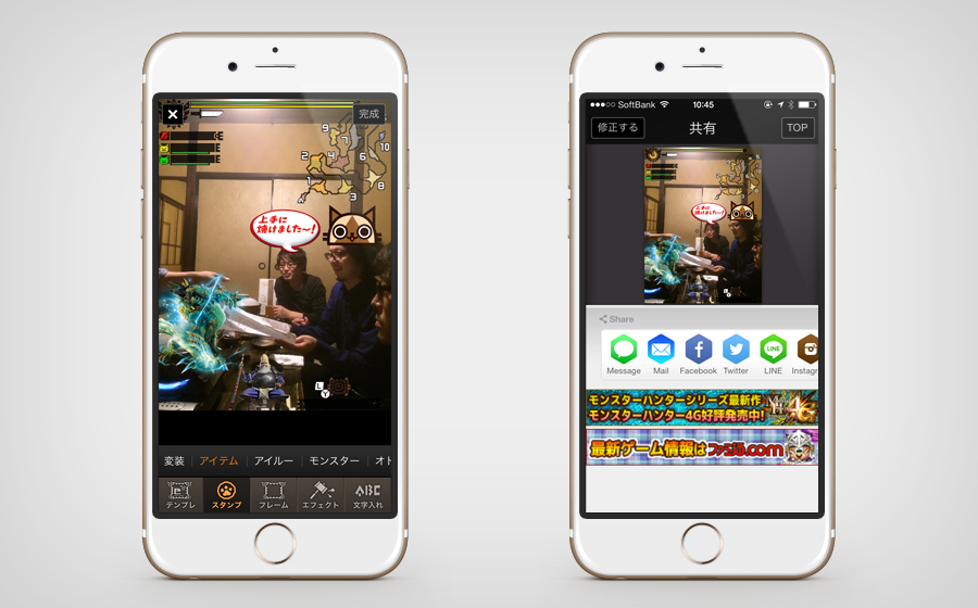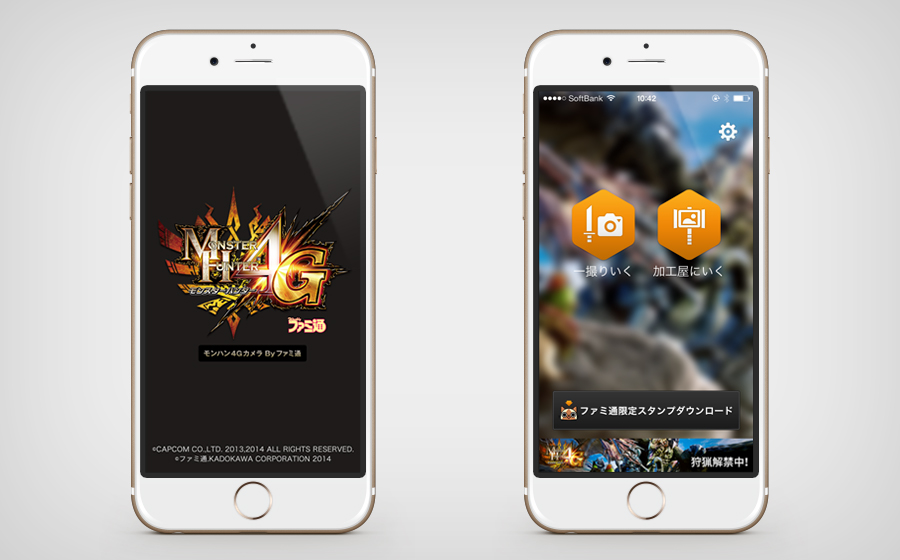 直感的な操作でモンハン4Gで使われているキャラクターやアイテムをデコレーションできるカメラアプリ「モンハン4Gカメラ Byファミ通」の設計一部とUIデザインを担当させていただきました。