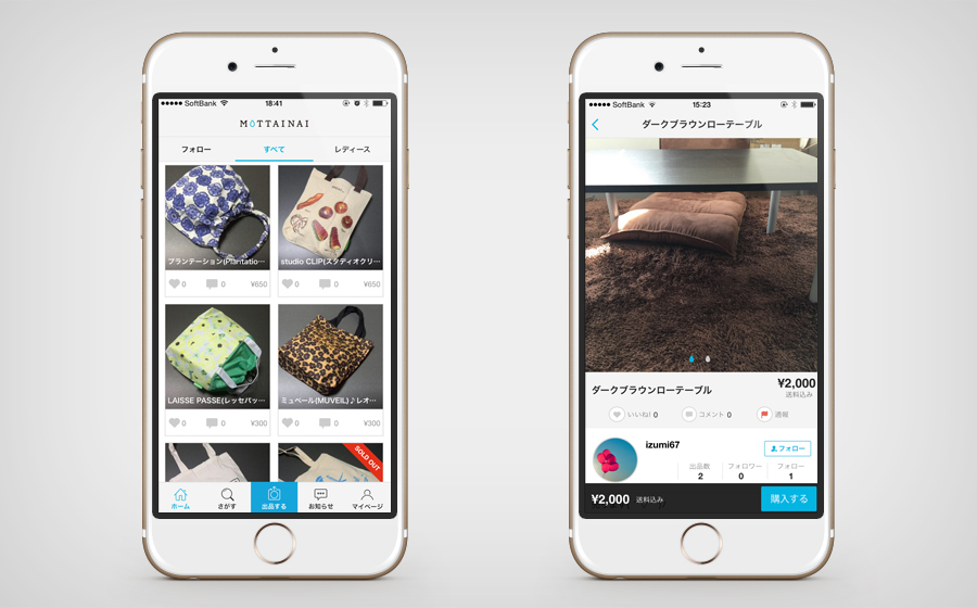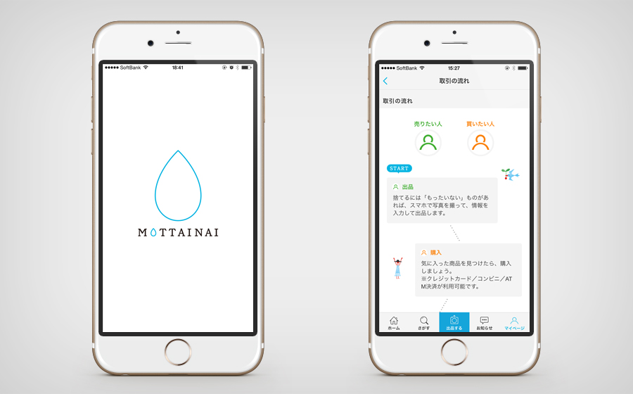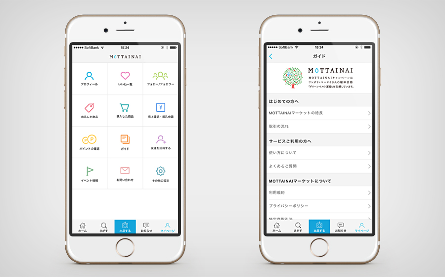 東京近郊で毎週末に開催している「MOTTAINAIフリーマーケット」と「MOTTAINAIてづくり市」のスマートフォンアプリのUIデザインを制作しました。